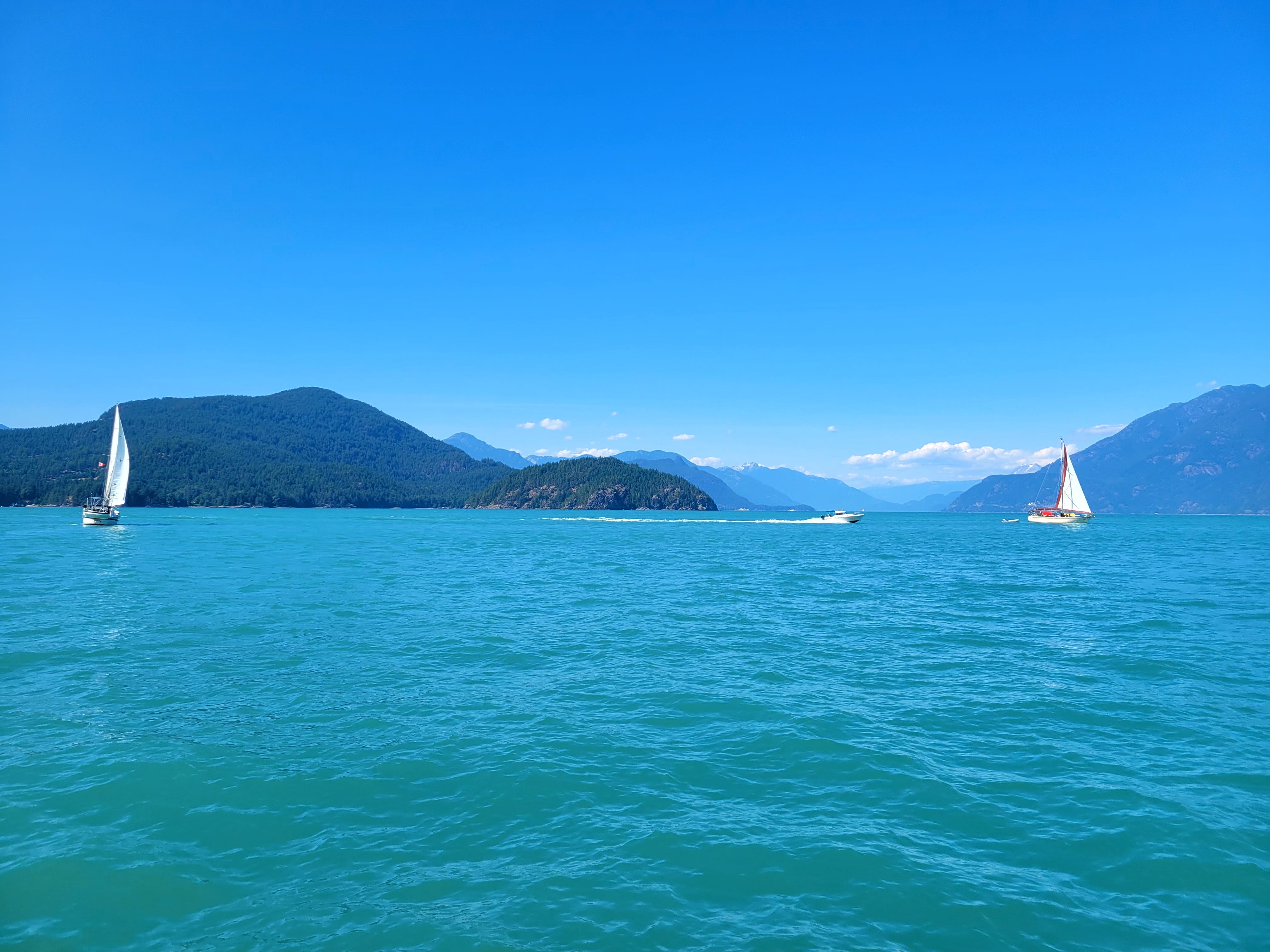 As to real life, or real memoir, we are loving the Sunshine Coast of BC. We enjoyed Vancouver, met some great folks, and stayed another day in the marina to enable us to leave the slip on Russel’s birthday and go sailing up in Howe Sound. Since then we’ve been hanging out at an island in a fairly quiet and not too crowded anchorage, enjoying the sunny, breezy weather and the gorgeous aqua sea. I’ll include a photo I took a couple of days ago while sailing nearby, because you won’t believe the color is real otherwise (no filter, it really is that green!). Though the water looks pretty, I’ve not been tempted to jump in, since it’s still not quite up to 70 degrees.